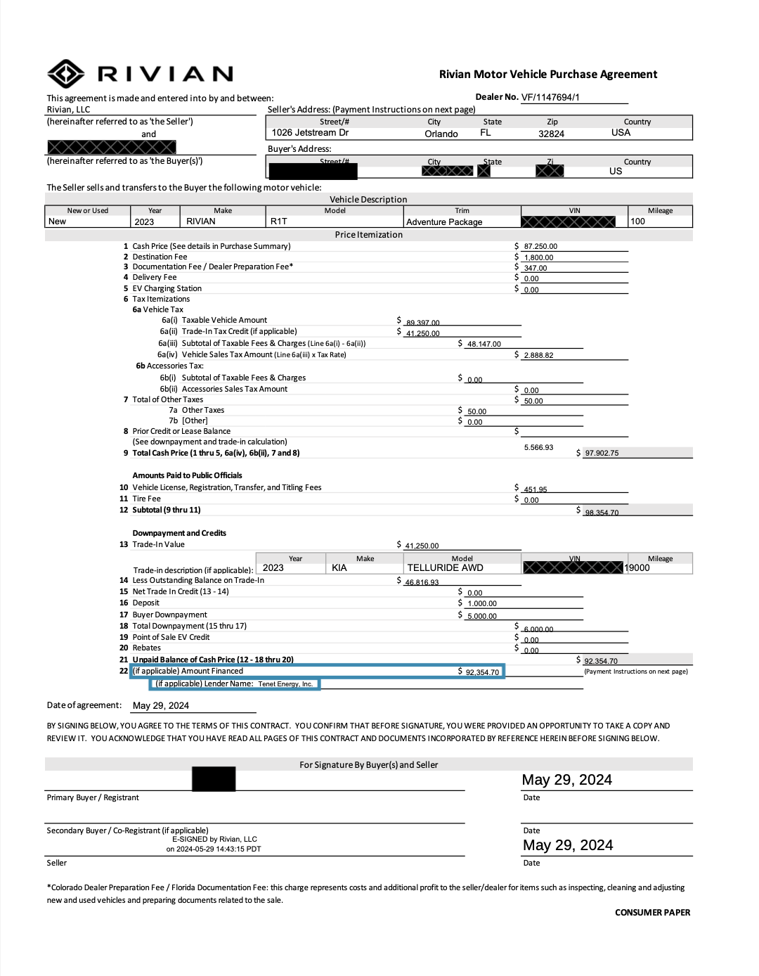 Your MVPA (Download Example Hereor See Example Below) should then become available within your Rivian App or Dashboard within a few weeks of your delivery. Check that the lienholder information, and financed amount are correct, and upload this document to your Tenet Dashboard in The Purchase Confirmation Task.