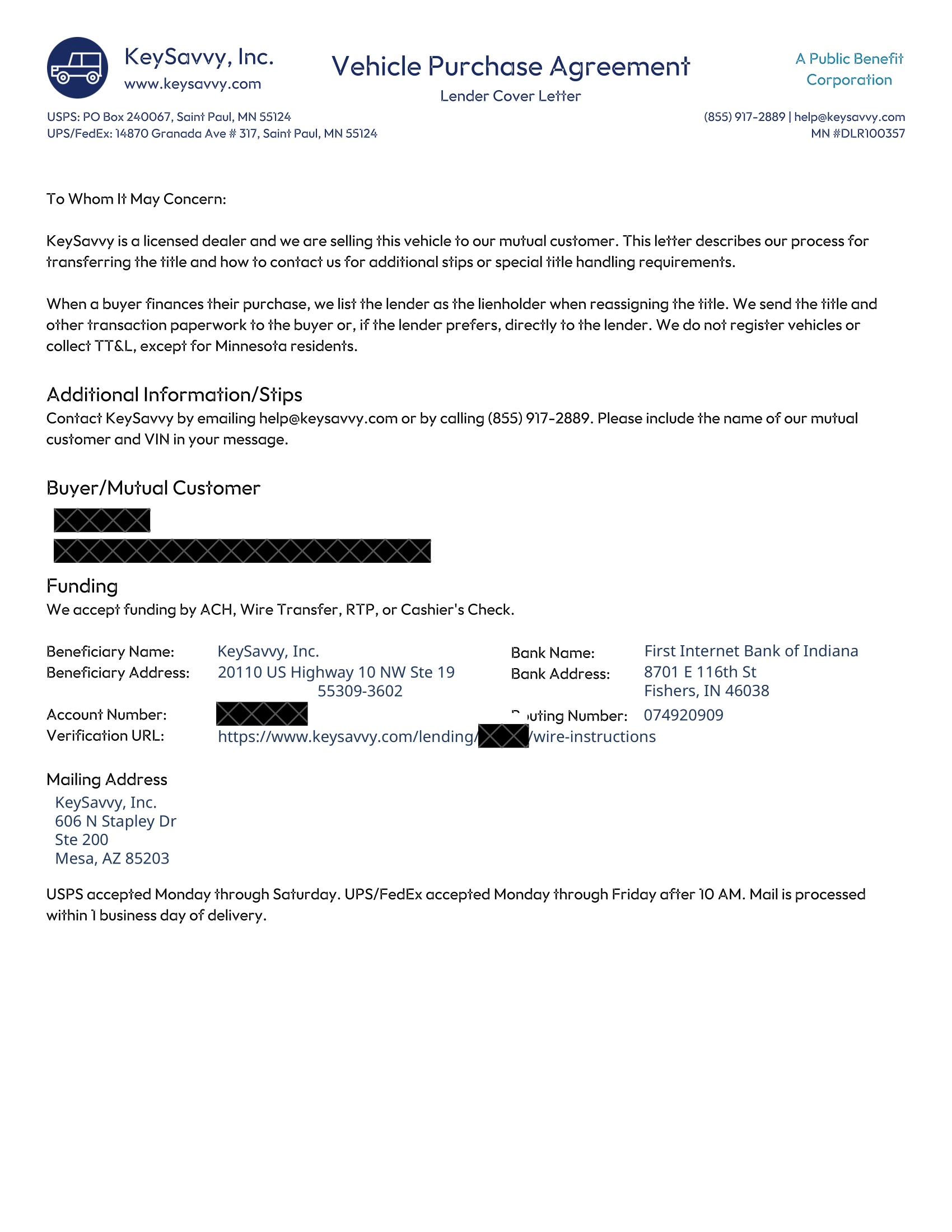 Note 2: Make sure The Vehicle Mileage is listed on your VPA. If mileage is missing, please contact The Seller, to fill in the mileage field in their KeySavvy Dashboard. Once the Seller notifies you that their KeySavvy listing has been updated, you can then regenerate your VPA with the vehicle mileage present. Also, make sure the mileage amount is the same that was listed on your application.