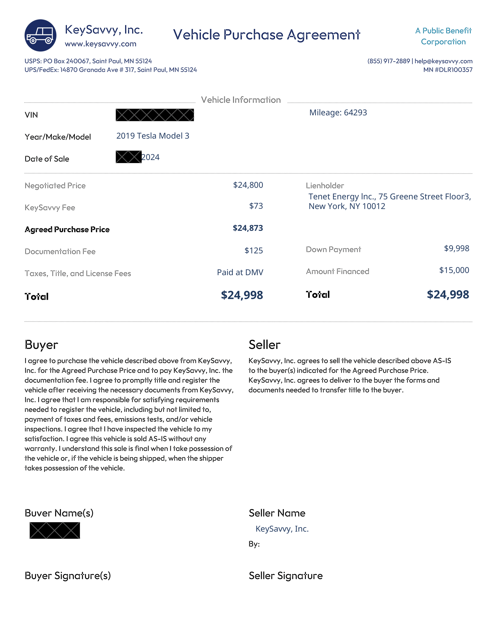 Your VPA (Download Example Here or See Example Below) will then become available within your KeySavvy Dashboard to "Download". Check that the lienholder information, financed amount, and down payment amounts are correct. Once downloaded, please upload this document to your Tenet Dashboard in the Purchase Confirmation Task.